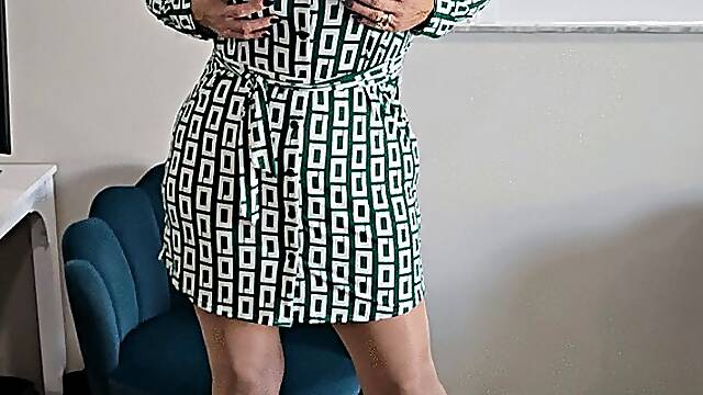 Mature stepmom with a big ass under a short dress, undresses. Curvy MILF with natural tits, plump legs in stockings, hairy pussy