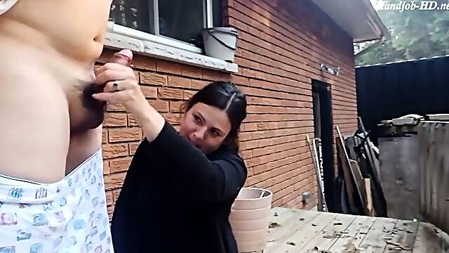 Amateur milf jerking off husbands meat pole outside